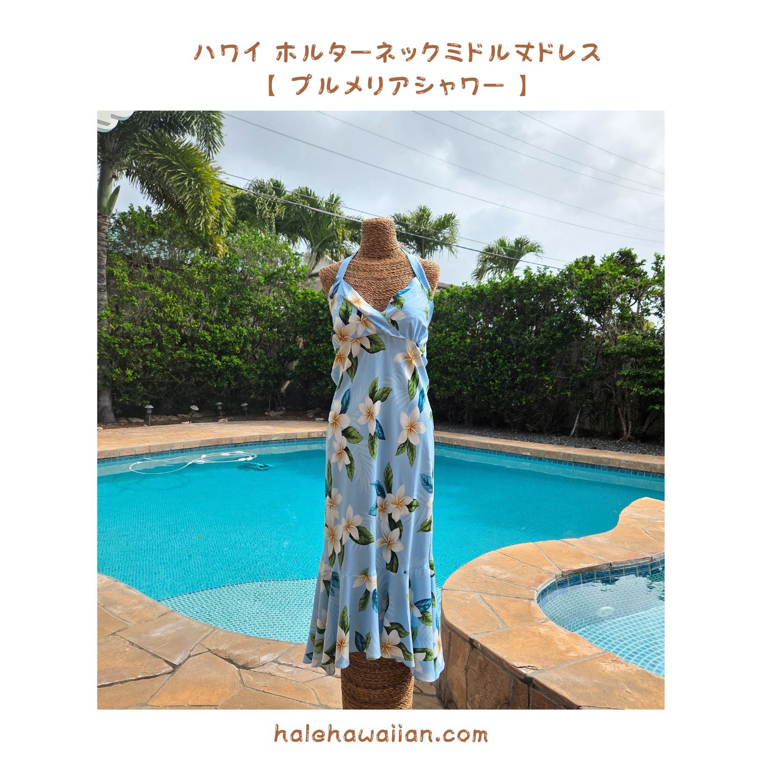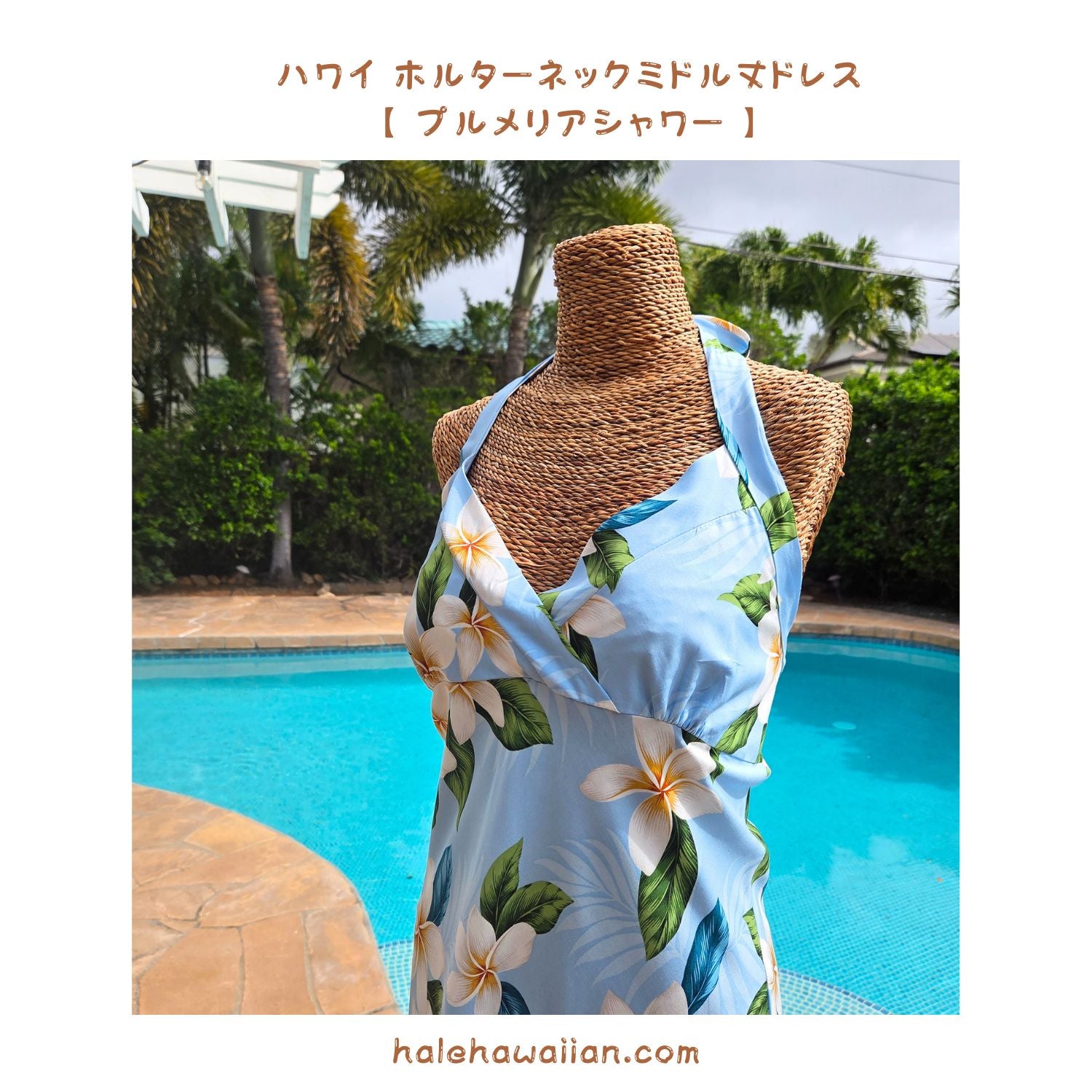 Hawaii Women's Halter Neck Mid-Length Dress 904R Special Order [Plumeria Shower] Blue