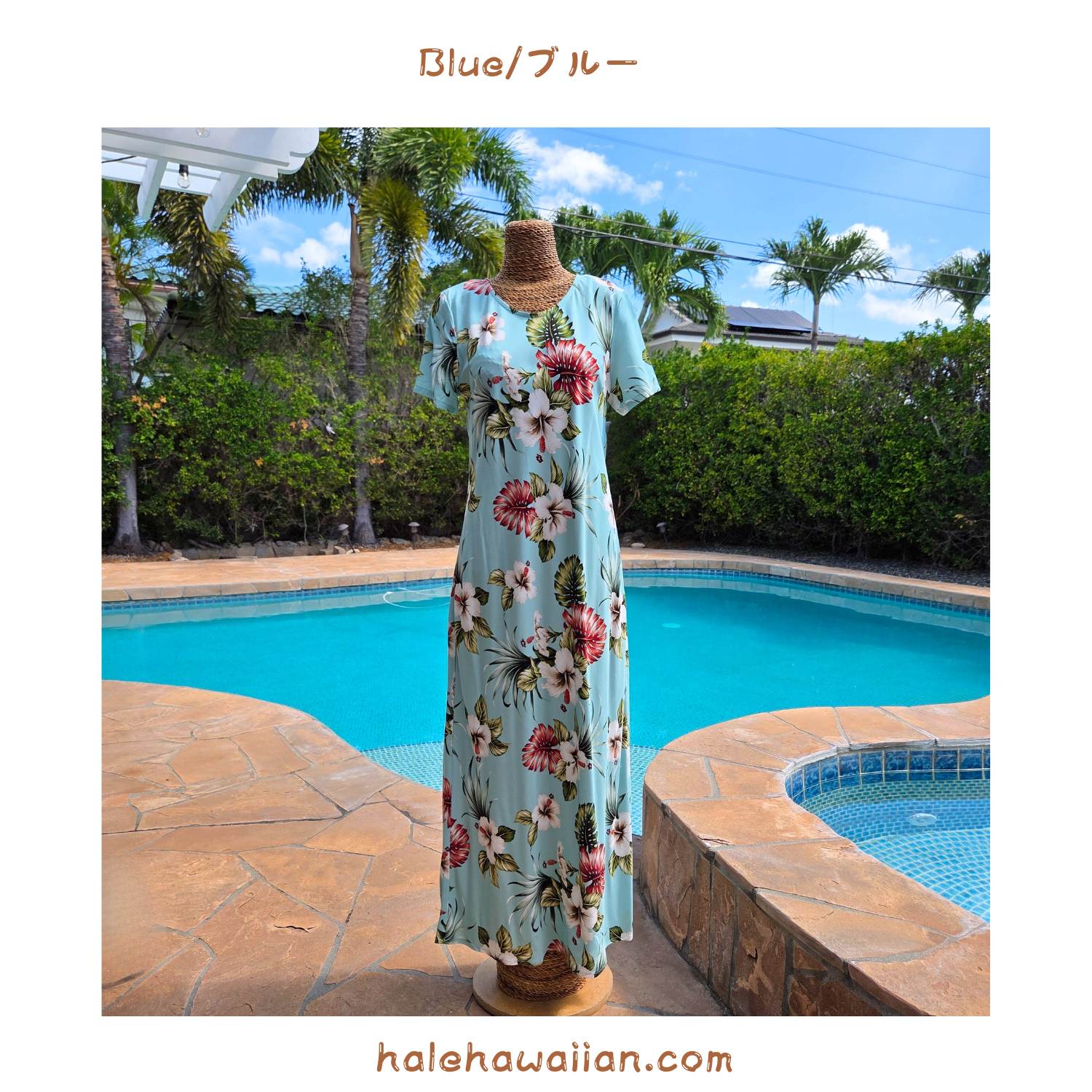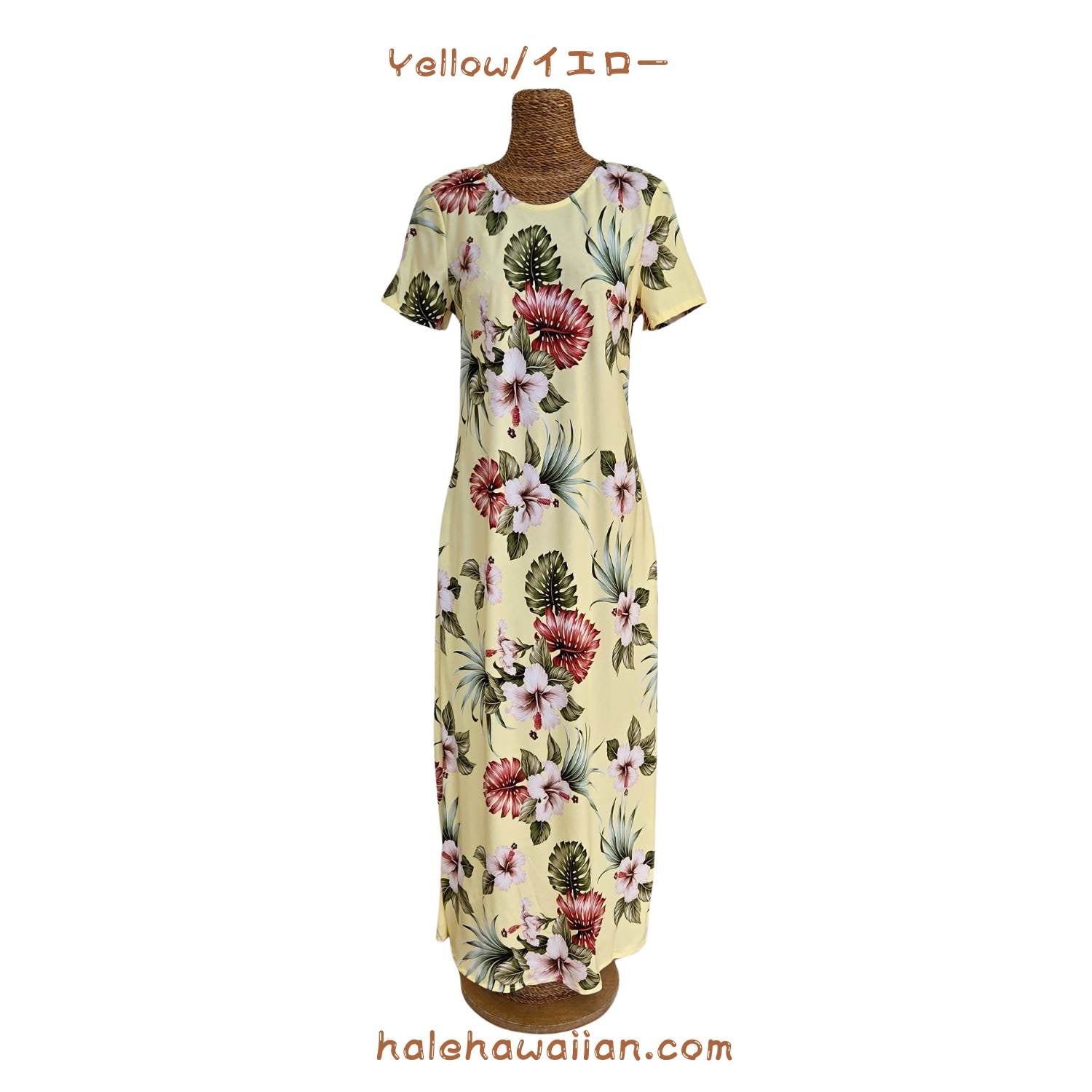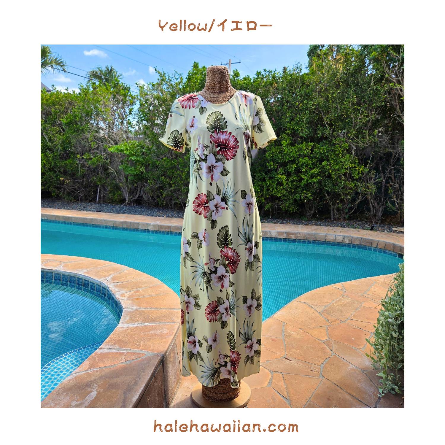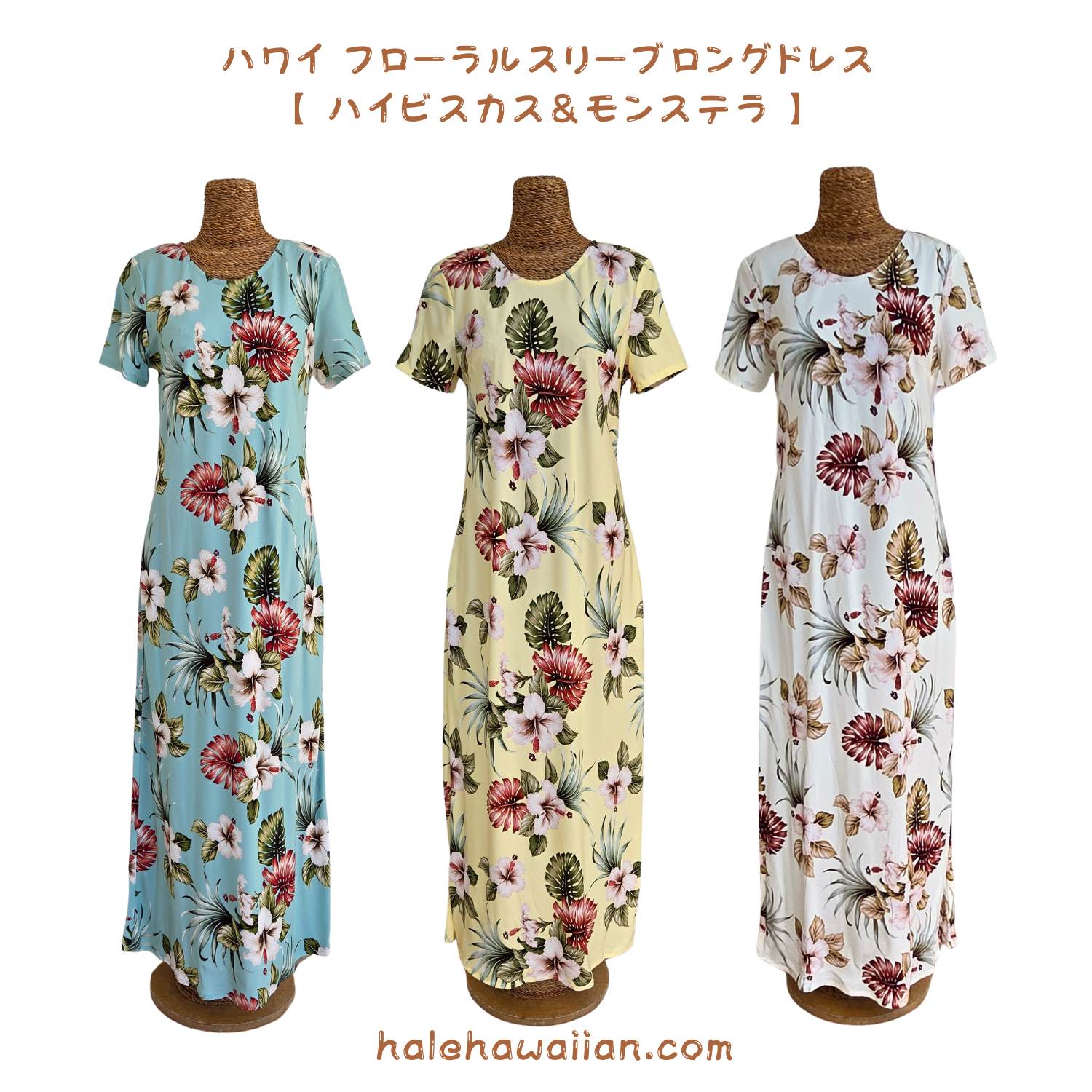 新作 ハワイアン レーヨン スリーブ ロングドレス 【 ハイビスカス&モンステラ 】